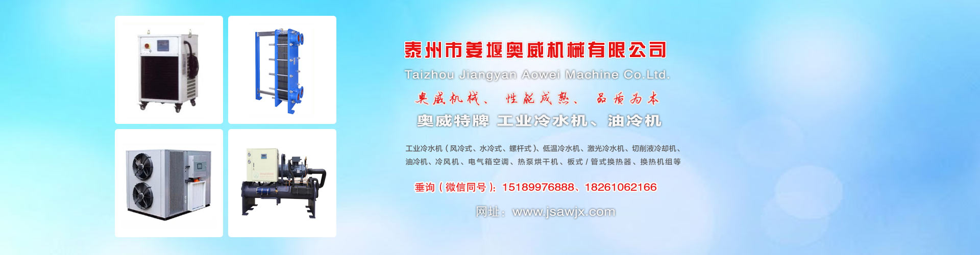 江蘇省,泰州市姜堰奧威機械有限公司,我公司是工業(yè)制冷設(shè)備,工業(yè)冷水機,油冷機,冷水機生產(chǎn)廠家(15189976888),公司集研發(fā)、設(shè)計、制造、銷售于一體。擁有20多年冷水機,油冷機,風冷式冷水機,水冷式冷水機,低溫冷水機,工業(yè)冷水機組,豐富生產(chǎn)經(jīng)驗,產(chǎn)品以成熟的品質(zhì),穩(wěn)定的性能,獲得到了廣大用的贊譽。